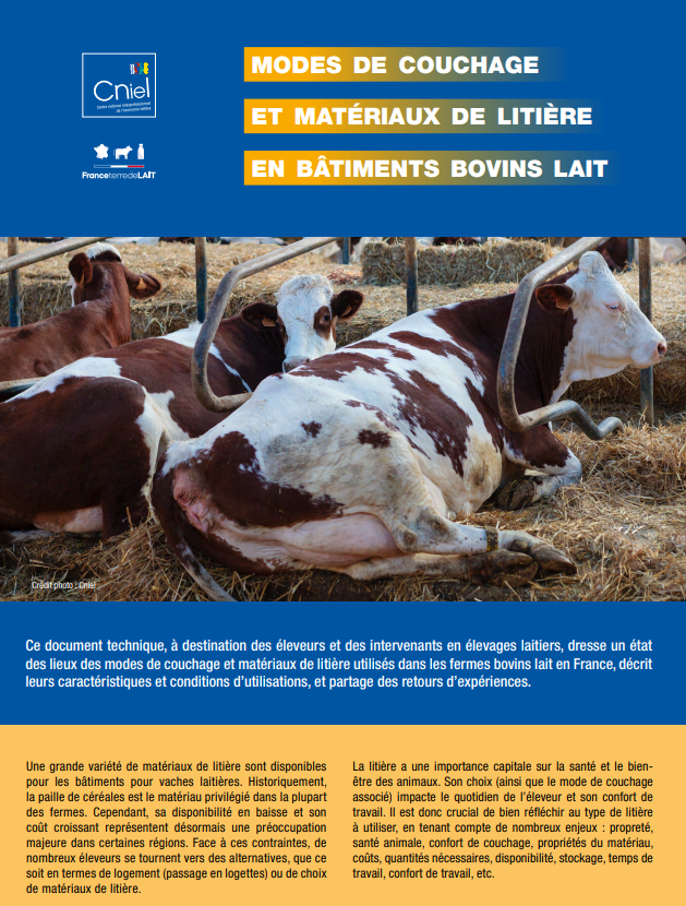 Ce document dresse un état des lieux des modes de couchage et matériaux de litière utilisés dans les fermes bovins lait en France, décrit leurs caractéristiques et conditions d’utilisations, et partage des retours d’expériences